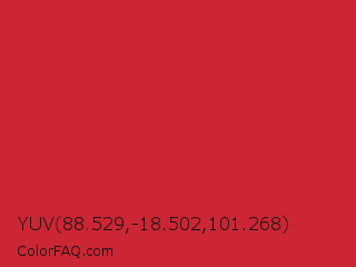 YUV 88.529,-18.502,101.268 Color is a normal red color and the nearest color is Amaranth Red #d3212d. Hex code #cc2533 and RGB value is rgb(204,37,51). In RGB color space, this color is composed of 80% red, 15% green, 20% blue, In CMYK color space, this color is composed of 0% cyan, 82% magenta, 75% yellow , 20% black , In HSL color space, this color has a hue angle of 355° , 69% saturation and 47% lightness.