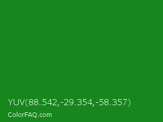 YUV 88.542,-29.354,-58.357 Color is a normal green color and the nearest color is Forest Green #228b22. Hex code #16861d and RGB value is rgb(22,134,29). In RGB color space, this color is composed of 9% red, 53% green, 11% blue, In CMYK color space, this color is composed of 84% cyan, 0% magenta, 78% yellow , 47% black , In HSL color space, this color has a hue angle of 124° , 72% saturation and 31% lightness.