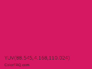 YUV 88.545,4.168,110.024 Color is a normal rose color and the nearest color is Dogwood Rose #d71868. Hex code #d61761 and RGB value is rgb(214,23,97). In RGB color space, this color is composed of 84% red, 9% green, 38% blue, In CMYK color space, this color is composed of 0% cyan, 89% magenta, 55% yellow , 16% black , In HSL color space, this color has a hue angle of 337° , 81% saturation and 46% lightness.
