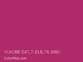 YUV 88.547,7.618,76.696 Color is a normal rose color and the nearest color is Rich Maroon #b03060. Hex code #b02968 and RGB value is rgb(176,41,104). In RGB color space, this color is composed of 69% red, 16% green, 41% blue, In CMYK color space, this color is composed of 0% cyan, 77% magenta, 41% yellow , 31% black , In HSL color space, this color has a hue angle of 332° , 62% saturation and 43% lightness.