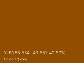 YUV 88.554,-43.657,49.503 Color is a dark orange color and the nearest color is Brown #964b00. Hex code #914d00 and RGB value is rgb(145,77,-0). In RGB color space, this color is composed of 57% red, 30% green, 0% blue, In CMYK color space, this color is composed of 0% cyan, 47% magenta, 100% yellow , 43% black , In HSL color space, this color has a hue angle of 32° , 100% saturation and 28% lightness.