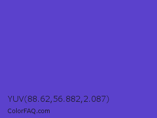 YUV 88.62,56.882,2.087 Color is a normal indigo color and the nearest color is Iris #5a4fcf. Hex code #5b41cc and RGB value is rgb(91,65,204). In RGB color space, this color is composed of 36% red, 25% green, 80% blue, In CMYK color space, this color is composed of 55% cyan, 68% magenta, 0% yellow , 20% black , In HSL color space, this color has a hue angle of 251° , 58% saturation and 53% lightness.