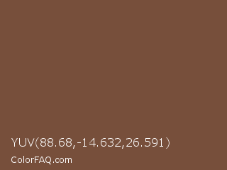 YUV 88.68,-14.632,26.591 Color is a normal orange color and the nearest color is Tuscan Brown Coffee #6f4e37. Hex code #774f3b and RGB value is rgb(119,79,59). In RGB color space, this color is composed of 47% red, 31% green, 23% blue, In CMYK color space, this color is composed of 0% cyan, 34% magenta, 50% yellow , 53% black , In HSL color space, this color has a hue angle of 20° , 34% saturation and 35% lightness.
