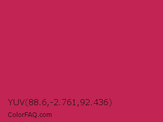 YUV 88.6,-2.761,92.436 Color is a normal rose color and the nearest color is Rose Red #c21e56. Hex code #c22453 and RGB value is rgb(194,36,83). In RGB color space, this color is composed of 76% red, 14% green, 33% blue, In CMYK color space, this color is composed of 0% cyan, 81% magenta, 57% yellow , 24% black , In HSL color space, this color has a hue angle of 342° , 69% saturation and 45% lightness.