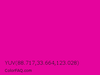 YUV 88.717,33.664,123.028 Color is a normal magenta color and the nearest color is Hollywood Cerise #f400a1. Hex code #e5049d and RGB value is rgb(229,4,157). In RGB color space, this color is composed of 90% red, 2% green, 62% blue, In CMYK color space, this color is composed of 0% cyan, 98% magenta, 31% yellow , 10% black , In HSL color space, this color has a hue angle of 319° , 97% saturation and 46% lightness.