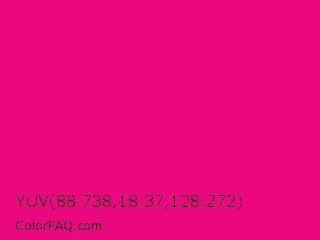YUV 88.738,18.37,128.272 Color is a normal rose color and the nearest color is Mexican Pink #e4007c. Hex code #eb077e and RGB value is rgb(235,7,126). In RGB color space, this color is composed of 92% red, 3% green, 49% blue, In CMYK color space, this color is composed of 0% cyan, 97% magenta, 46% yellow , 8% black , In HSL color space, this color has a hue angle of 329° , 94% saturation and 47% lightness.