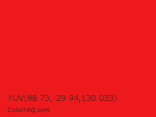 YUV 88.73,-29.94,130.033 Color is a normal red color and the nearest color is Red Pigment #ed1c24. Hex code #ed191c and RGB value is rgb(237,25,28). In RGB color space, this color is composed of 93% red, 10% green, 11% blue, In CMYK color space, this color is composed of 0% cyan, 89% magenta, 88% yellow , 7% black , In HSL color space, this color has a hue angle of 359° , 85% saturation and 51% lightness.