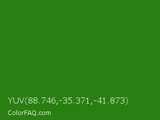 YUV 88.746,-35.371,-41.873 Color is a dark green color and the nearest color is Bilbao #327c14. Hex code #297f11 and RGB value is rgb(41,127,17). In RGB color space, this color is composed of 16% red, 50% green, 7% blue, In CMYK color space, this color is composed of 68% cyan, 0% magenta, 87% yellow , 50% black , In HSL color space, this color has a hue angle of 107° , 76% saturation and 28% lightness.