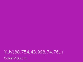 YUV 88.754,43.998,74.761 Color is a normal magenta color and the nearest color is Heliotrope Magenta #aa00bb. Hex code #ae1cb2 and RGB value is rgb(174,28,178). In RGB color space, this color is composed of 68% red, 11% green, 70% blue, In CMYK color space, this color is composed of 2% cyan, 84% magenta, 0% yellow , 30% black , In HSL color space, this color has a hue angle of 298° , 73% saturation and 40% lightness.