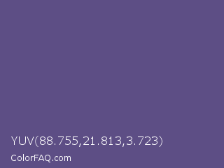 YUV 88.755,21.813,3.723 Color is a normal indigo color and the nearest color is Cyber Grape #58427c. Hex code #5d4e85 and RGB value is rgb(93,78,133). In RGB color space, this color is composed of 36% red, 31% green, 52% blue, In CMYK color space, this color is composed of 30% cyan, 41% magenta, 0% yellow , 48% black , In HSL color space, this color has a hue angle of 256° , 26% saturation and 41% lightness.