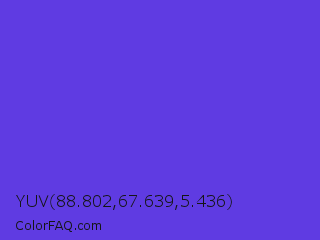 YUV 88.802,67.639,5.436 Color is a normal indigo color and the nearest color is Majorelle Blue #6050dc. Hex code #5f3be2 and RGB value is rgb(95,59,226). In RGB color space, this color is composed of 37% red, 23% green, 89% blue, In CMYK color space, this color is composed of 58% cyan, 74% magenta, 0% yellow , 11% black , In HSL color space, this color has a hue angle of 253° , 74% saturation and 56% lightness.