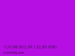 YUV 88.802,68.132,80.858 Color is a normal purple color and the nearest color is Vivid Mulberry #b80ce3. Hex code #b50fe3 and RGB value is rgb(181,15,227). In RGB color space, this color is composed of 71% red, 6% green, 89% blue, In CMYK color space, this color is composed of 20% cyan, 93% magenta, 0% yellow , 11% black , In HSL color space, this color has a hue angle of 287° , 88% saturation and 47% lightness.