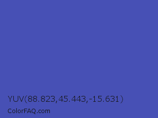 YUV 88.823,45.443,-15.631 Color is a normal blue color and the nearest color is Ocean Blue #4f42b5. Hex code #4750b5 and RGB value is rgb(71,80,181). In RGB color space, this color is composed of 28% red, 31% green, 71% blue, In CMYK color space, this color is composed of 61% cyan, 56% magenta, 0% yellow , 29% black , In HSL color space, this color has a hue angle of 235° , 44% saturation and 49% lightness.
