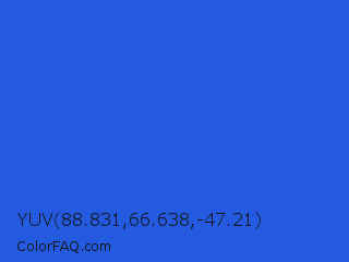 YUV 88.831,66.638,-47.21 Color is a normal blue color and the nearest color is Mariner #286acd. Hex code #235ae0 and RGB value is rgb(35,90,224). In RGB color space, this color is composed of 14% red, 35% green, 88% blue, In CMYK color space, this color is composed of 84% cyan, 60% magenta, 0% yellow , 12% black , In HSL color space, this color has a hue angle of 223° , 75% saturation and 51% lightness.