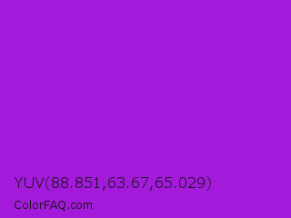 YUV 88.851,63.67,65.029 Color is a normal purple color and the nearest color is Veronica #a020f0. Hex code #a31ada and RGB value is rgb(163,26,218). In RGB color space, this color is composed of 64% red, 10% green, 85% blue, In CMYK color space, this color is composed of 25% cyan, 88% magenta, 0% yellow , 15% black , In HSL color space, this color has a hue angle of 283° , 79% saturation and 48% lightness.