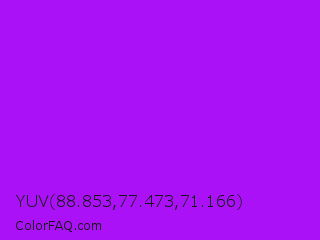 YUV 88.853,77.473,71.166 Color is a normal purple color and the nearest color is Veronica #a020f0. Hex code #aa11f6 and RGB value is rgb(170,17,246). In RGB color space, this color is composed of 67% red, 7% green, 96% blue, In CMYK color space, this color is composed of 31% cyan, 93% magenta, 0% yellow , 4% black , In HSL color space, this color has a hue angle of 280° , 93% saturation and 52% lightness.