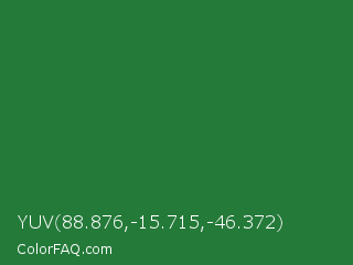 YUV 88.876,-15.715,-46.372 Color is a normal green color and the nearest color is Dark Spring Green #177245. Hex code #247a39 and RGB value is rgb(36,122,57). In RGB color space, this color is composed of 14% red, 48% green, 22% blue, In CMYK color space, this color is composed of 70% cyan, 0% magenta, 53% yellow , 52% black , In HSL color space, this color has a hue angle of 135° , 54% saturation and 31% lightness.