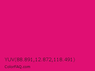 YUV 88.891,12.872,118.491 Color is a normal rose color and the nearest color is Red Purple #e40078. Hex code #e00f73 and RGB value is rgb(224,15,115). In RGB color space, this color is composed of 88% red, 6% green, 45% blue, In CMYK color space, this color is composed of 0% cyan, 93% magenta, 49% yellow , 12% black , In HSL color space, this color has a hue angle of 331° , 87% saturation and 47% lightness.