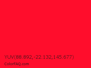 YUV 88.892,-22.132,145.677 Color is a normal red color and the nearest color is Torch Red #fd0e35. Hex code #ff0d2c and RGB value is rgb(255,13,44). In RGB color space, this color is composed of 100% red, 5% green, 17% blue, In CMYK color space, this color is composed of 0% cyan, 95% magenta, 83% yellow , 0% black , In HSL color space, this color has a hue angle of 352° , 100% saturation and 53% lightness.