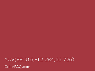 YUV 88.916,-12.284,66.726 Color is a normal red color and the nearest color is Stiletto #9c3336. Hex code #a53740 and RGB value is rgb(165,55,64). In RGB color space, this color is composed of 65% red, 22% green, 25% blue, In CMYK color space, this color is composed of 0% cyan, 67% magenta, 61% yellow , 35% black , In HSL color space, this color has a hue angle of 355° , 50% saturation and 43% lightness.