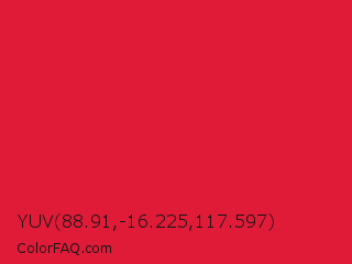 YUV 88.91,-16.225,117.597 Color is a normal red color and the nearest color is Crimson #dc143c. Hex code #df1b38 and RGB value is rgb(223,27,56). In RGB color space, this color is composed of 87% red, 11% green, 22% blue, In CMYK color space, this color is composed of 0% cyan, 88% magenta, 75% yellow , 13% black , In HSL color space, this color has a hue angle of 351° , 78% saturation and 49% lightness.
