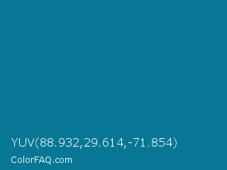 YUV 88.932,29.614,-71.854 Color is a normal cyan color and the nearest color is Metallic Seaweed #0a7e8c. Hex code #077795 and RGB value is rgb(7,119,149). In RGB color space, this color is composed of 3% red, 47% green, 58% blue, In CMYK color space, this color is composed of 95% cyan, 20% magenta, 0% yellow , 42% black , In HSL color space, this color has a hue angle of 193° , 91% saturation and 31% lightness.