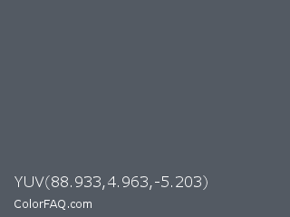 YUV 88.933,4.963,-5.203 Color is a normal blue color and the nearest color is Scarpa Flow #585562. Hex code #535a63 and RGB value is rgb(83,90,99). In RGB color space, this color is composed of 33% red, 35% green, 39% blue, In CMYK color space, this color is composed of 16% cyan, 9% magenta, 0% yellow , 61% black , In HSL color space, this color has a hue angle of 214° , 9% saturation and 36% lightness.