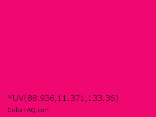 YUV 88.936,11.371,133.36 Color is a normal rose color and the nearest color is Vivid Raspberry #ff006c. Hex code #f10770 and RGB value is rgb(241,7,112). In RGB color space, this color is composed of 95% red, 3% green, 44% blue, In CMYK color space, this color is composed of 0% cyan, 97% magenta, 54% yellow , 5% black , In HSL color space, this color has a hue angle of 333° , 94% saturation and 49% lightness.