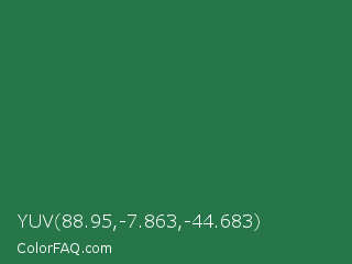 YUV 88.95,-7.863,-44.683 Color is a normal green color and the nearest color is Dark Spring Green #177245. Hex code #267649 and RGB value is rgb(38,118,73). In RGB color space, this color is composed of 15% red, 46% green, 29% blue, In CMYK color space, this color is composed of 68% cyan, 0% magenta, 38% yellow , 54% black , In HSL color space, this color has a hue angle of 146° , 51% saturation and 31% lightness.