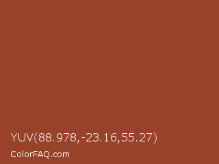YUV 88.978,-23.16,55.27 Color is a normal red color and the nearest color is Cumin #924321. Hex code #98422a and RGB value is rgb(152,66,42). In RGB color space, this color is composed of 60% red, 26% green, 16% blue, In CMYK color space, this color is composed of 0% cyan, 57% magenta, 72% yellow , 40% black , In HSL color space, this color has a hue angle of 13° , 57% saturation and 38% lightness.