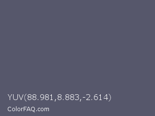 YUV 88.981,8.883,-2.614 Color is a normal blue color and the nearest color is Scarpa Flow #585562. Hex code #56576b and RGB value is rgb(86,87,107). In RGB color space, this color is composed of 34% red, 34% green, 42% blue, In CMYK color space, this color is composed of 20% cyan, 19% magenta, 0% yellow , 58% black , In HSL color space, this color has a hue angle of 237° , 11% saturation and 38% lightness.