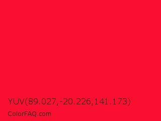 YUV 89.027,-20.226,141.173 Color is a normal red color and the nearest color is Torch Red #fd0e35. Hex code #fa0f30 and RGB value is rgb(250,15,48). In RGB color space, this color is composed of 98% red, 6% green, 19% blue, In CMYK color space, this color is composed of 0% cyan, 94% magenta, 81% yellow , 2% black , In HSL color space, this color has a hue angle of 352° , 96% saturation and 52% lightness.