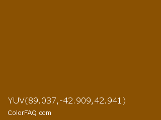 YUV 89.037,-42.909,42.941 Color is a dark orange color and the nearest color is Rusty Nail #86560a. Hex code #8a5102 and RGB value is rgb(138,81,2). In RGB color space, this color is composed of 54% red, 32% green, 1% blue, In CMYK color space, this color is composed of 0% cyan, 41% magenta, 99% yellow , 46% black , In HSL color space, this color has a hue angle of 35° , 97% saturation and 27% lightness.