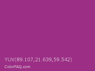 YUV 89.107,21.639,59.542 Color is a normal magenta color and the nearest color is Maximum Red Purple #a63a79. Hex code #9d2e85 and RGB value is rgb(157,46,133). In RGB color space, this color is composed of 62% red, 18% green, 52% blue, In CMYK color space, this color is composed of 0% cyan, 71% magenta, 15% yellow , 38% black , In HSL color space, this color has a hue angle of 313° , 55% saturation and 40% lightness.