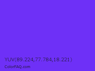 YUV 89.224,77.784,18.221 Color is a normal indigo color and the nearest color is Blue Violet #8a2be2. Hex code #6e30f7 and RGB value is rgb(110,48,247). In RGB color space, this color is composed of 43% red, 19% green, 97% blue, In CMYK color space, this color is composed of 55% cyan, 81% magenta, 0% yellow , 3% black , In HSL color space, this color has a hue angle of 259° , 93% saturation and 58% lightness.