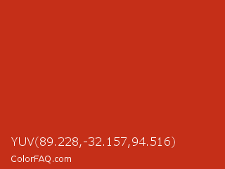 YUV 89.228,-32.157,94.516 Color is a normal red color and the nearest color is Thunderbird #c02b18. Hex code #c52f18 and RGB value is rgb(197,47,24). In RGB color space, this color is composed of 77% red, 18% green, 9% blue, In CMYK color space, this color is composed of 0% cyan, 76% magenta, 88% yellow , 23% black , In HSL color space, this color has a hue angle of 8° , 78% saturation and 43% lightness.