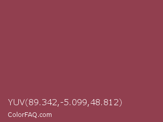 YUV 89.342,-5.099,48.812 Color is a normal red color and the nearest color is Quinacridone Magenta #8e3a59. Hex code #913f4f and RGB value is rgb(145,63,79). In RGB color space, this color is composed of 57% red, 25% green, 31% blue, In CMYK color space, this color is composed of 0% cyan, 57% magenta, 46% yellow , 43% black , In HSL color space, this color has a hue angle of 348° , 39% saturation and 41% lightness.