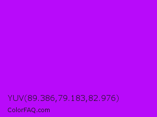YUV 89.386,79.183,82.976 Color is a normal purple color and the nearest color is Electric Purple #bf00ff. Hex code #b80afa and RGB value is rgb(184,10,250). In RGB color space, this color is composed of 72% red, 4% green, 98% blue, In CMYK color space, this color is composed of 26% cyan, 96% magenta, 0% yellow , 2% black , In HSL color space, this color has a hue angle of 284° , 96% saturation and 51% lightness.