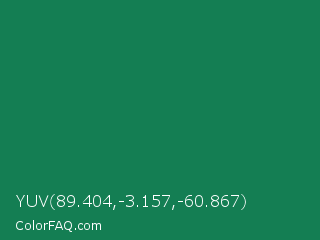 YUV 89.404,-3.157,-60.867 Color is a dark green color and the nearest color is Salem #097f4b. Hex code #147e53 and RGB value is rgb(20,126,83). In RGB color space, this color is composed of 8% red, 49% green, 33% blue, In CMYK color space, this color is composed of 84% cyan, 0% magenta, 34% yellow , 51% black , In HSL color space, this color has a hue angle of 156° , 73% saturation and 29% lightness.
