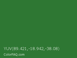 YUV 89.421,-18.942,-38.08 Color is a normal green color and the nearest color is Mughal Green #306030. Hex code #2e7733 and RGB value is rgb(46,119,51). In RGB color space, this color is composed of 18% red, 47% green, 20% blue, In CMYK color space, this color is composed of 61% cyan, 0% magenta, 57% yellow , 53% black , In HSL color space, this color has a hue angle of 124° , 44% saturation and 32% lightness.