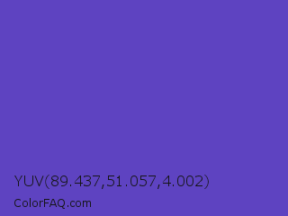 YUV 89.437,51.057,4.002 Color is a normal indigo color and the nearest color is Plump Purple #5946b2. Hex code #5e43c1 and RGB value is rgb(94,67,193). In RGB color space, this color is composed of 37% red, 26% green, 76% blue, In CMYK color space, this color is composed of 51% cyan, 65% magenta, 0% yellow , 24% black , In HSL color space, this color has a hue angle of 253° , 50% saturation and 51% lightness.