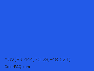 YUV 89.444,70.28,-48.624 Color is a normal blue color and the nearest color is Mariner #286acd. Hex code #225ae8 and RGB value is rgb(34,90,232). In RGB color space, this color is composed of 13% red, 35% green, 91% blue, In CMYK color space, this color is composed of 85% cyan, 61% magenta, 0% yellow , 9% black , In HSL color space, this color has a hue angle of 223° , 81% saturation and 52% lightness.