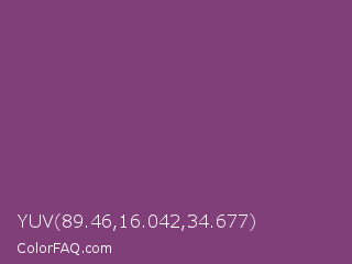 YUV 89.46,16.042,34.677 Color is a normal magenta color and the nearest color is Razzmic Berry Crayola #843179. Hex code #813f7a and RGB value is rgb(129,63,122). In RGB color space, this color is composed of 51% red, 25% green, 48% blue, In CMYK color space, this color is composed of 0% cyan, 51% magenta, 5% yellow , 49% black , In HSL color space, this color has a hue angle of 306° , 34% saturation and 38% lightness.