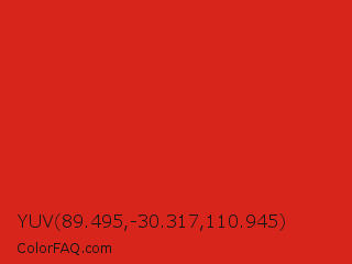 YUV 89.495,-30.317,110.945 Color is a normal red color and the nearest color is Maximum Red #d92121. Hex code #d8251c and RGB value is rgb(216,37,28). In RGB color space, this color is composed of 85% red, 15% green, 11% blue, In CMYK color space, this color is composed of 0% cyan, 83% magenta, 87% yellow , 15% black , In HSL color space, this color has a hue angle of 3° , 77% saturation and 48% lightness.