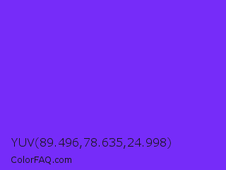YUV 89.496,78.635,24.998 Color is a normal violet color and the nearest color is Blue Violet #8a2be2. Hex code #762cf9 and RGB value is rgb(118,44,249). In RGB color space, this color is composed of 46% red, 17% green, 98% blue, In CMYK color space, this color is composed of 53% cyan, 82% magenta, 0% yellow , 2% black , In HSL color space, this color has a hue angle of 262° , 94% saturation and 57% lightness.