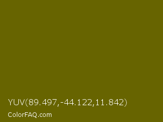 YUV 89.497,-44.122,11.842 Color is a very dark yellow color and the nearest color is Bronze Yellow #737000. Hex code #676400 and RGB value is rgb(103,100,-0). In RGB color space, this color is composed of 40% red, 39% green, 0% blue, In CMYK color space, this color is composed of 0% cyan, 3% magenta, 100% yellow , 60% black , In HSL color space, this color has a hue angle of 58° , 100% saturation and 20% lightness.