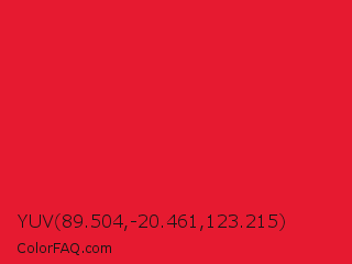YUV 89.504,-20.461,123.215 Color is a normal red color and the nearest color is Alizarin Crimson #e32636. Hex code #e61a30 and RGB value is rgb(230,26,48). In RGB color space, this color is composed of 90% red, 10% green, 19% blue, In CMYK color space, this color is composed of 0% cyan, 89% magenta, 79% yellow , 10% black , In HSL color space, this color has a hue angle of 354° , 80% saturation and 50% lightness.