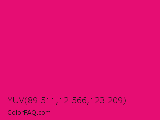 YUV 89.511,12.566,123.209 Color is a normal rose color and the nearest color is Red Purple #e40078. Hex code #e60d73 and RGB value is rgb(230,13,115). In RGB color space, this color is composed of 90% red, 5% green, 45% blue, In CMYK color space, this color is composed of 0% cyan, 94% magenta, 50% yellow , 10% black , In HSL color space, this color has a hue angle of 332° , 89% saturation and 48% lightness.