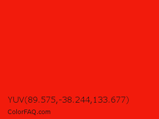YUV 89.575,-38.244,133.677 Color is a normal red color and the nearest color is Red RYB #fe2712. Hex code #f21b0c and RGB value is rgb(242,27,12). In RGB color space, this color is composed of 95% red, 11% green, 5% blue, In CMYK color space, this color is composed of 0% cyan, 89% magenta, 95% yellow , 5% black , In HSL color space, this color has a hue angle of 4° , 91% saturation and 50% lightness.