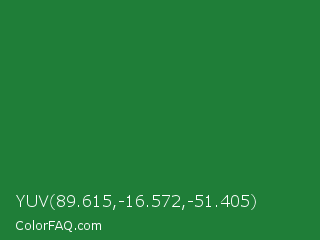 YUV 89.615,-16.572,-51.405 Color is a normal green color and the nearest color is Dark Spring Green #177245. Hex code #1f7e38 and RGB value is rgb(31,126,56). In RGB color space, this color is composed of 12% red, 49% green, 22% blue, In CMYK color space, this color is composed of 75% cyan, 0% magenta, 56% yellow , 51% black , In HSL color space, this color has a hue angle of 136° , 61% saturation and 31% lightness.